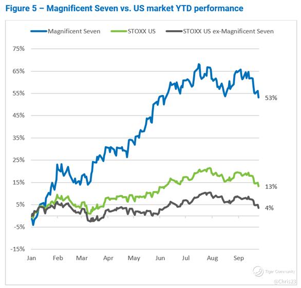 Despite the recent rally, it is not too late to consider investing in small-cap stocks, as they continue to trade at attractive valuations compared to their larger peers. This is attributed to the transformative impact of AI developments and cautious investor sentiment, leading to a preference for the perceived safety of mega-cap stocks with robust financials and promising growth prospects driven by AI catalysts. Notably, the "Magnificent Seven" stocks have delivered a remarkable 53% return this year, in stark contrast to the meagre 4% return observed in the rest of the US stock market. This implies that, excluding the stretched valuations of the "Magnificent Seven," US equities remain appealing.