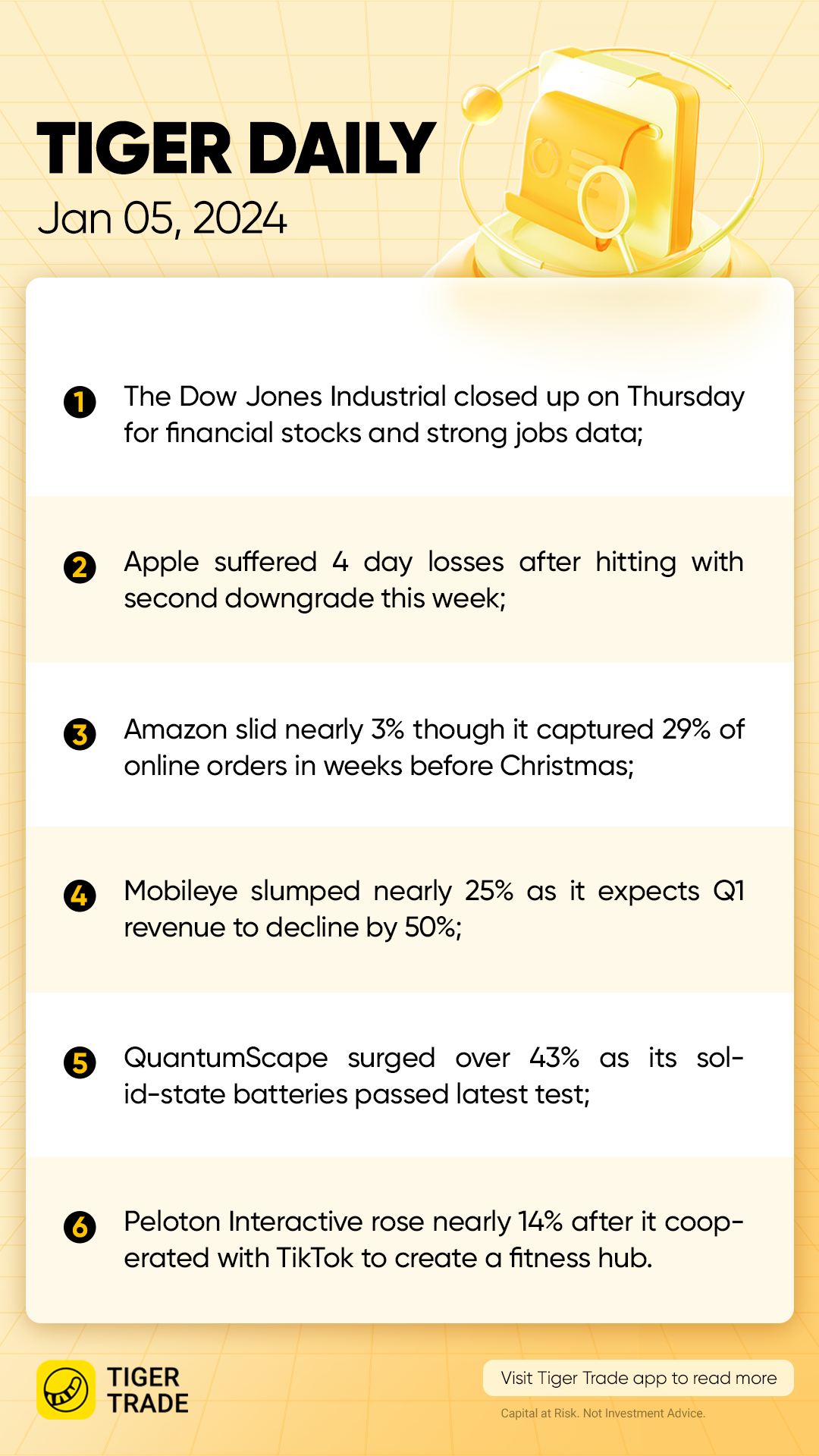 The Dow Jones Industrial closed up on Thursday, as financial stocks and strong jobs data prompted investors to delay estimates of when interest-rate cuts could begin.