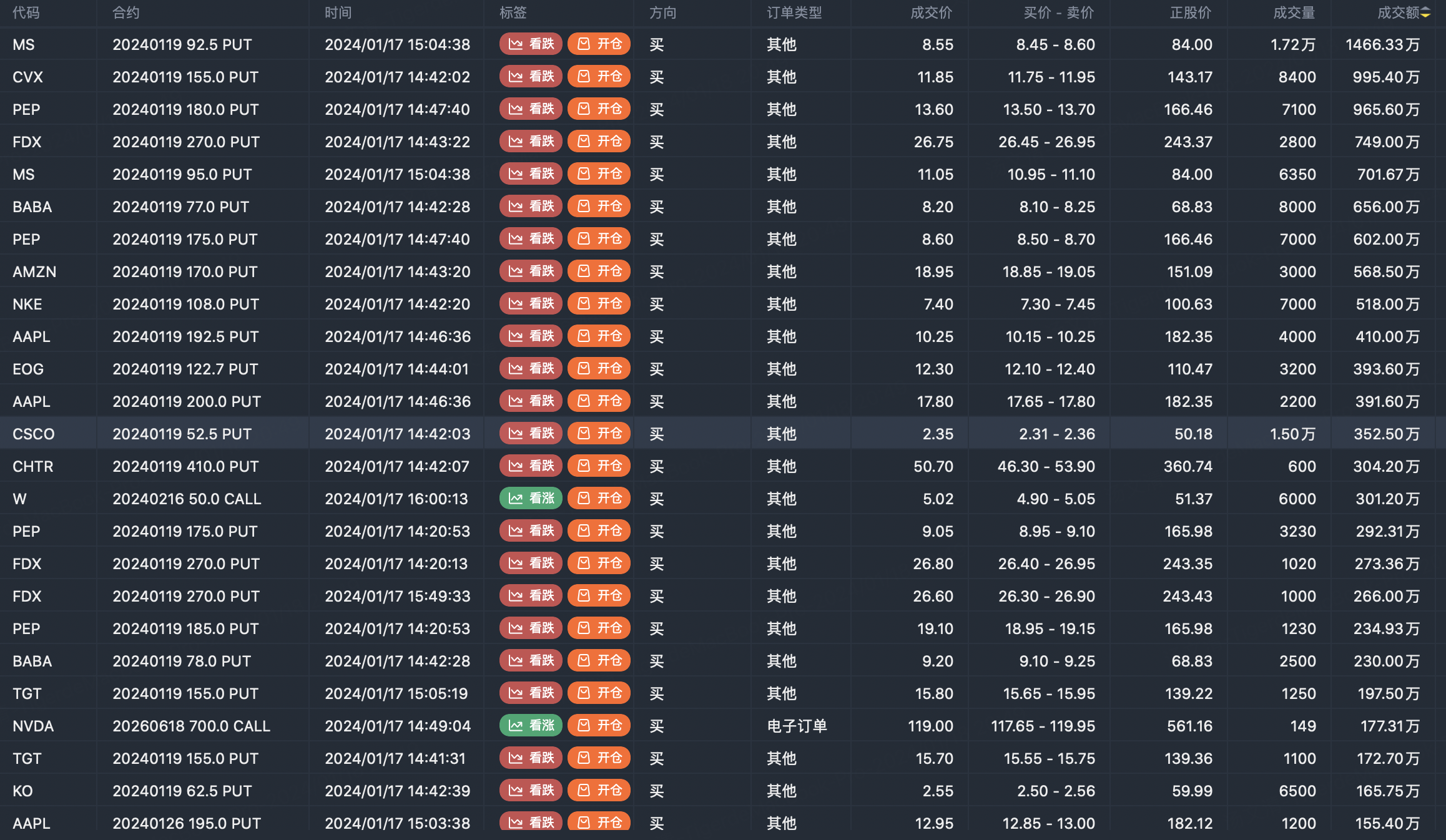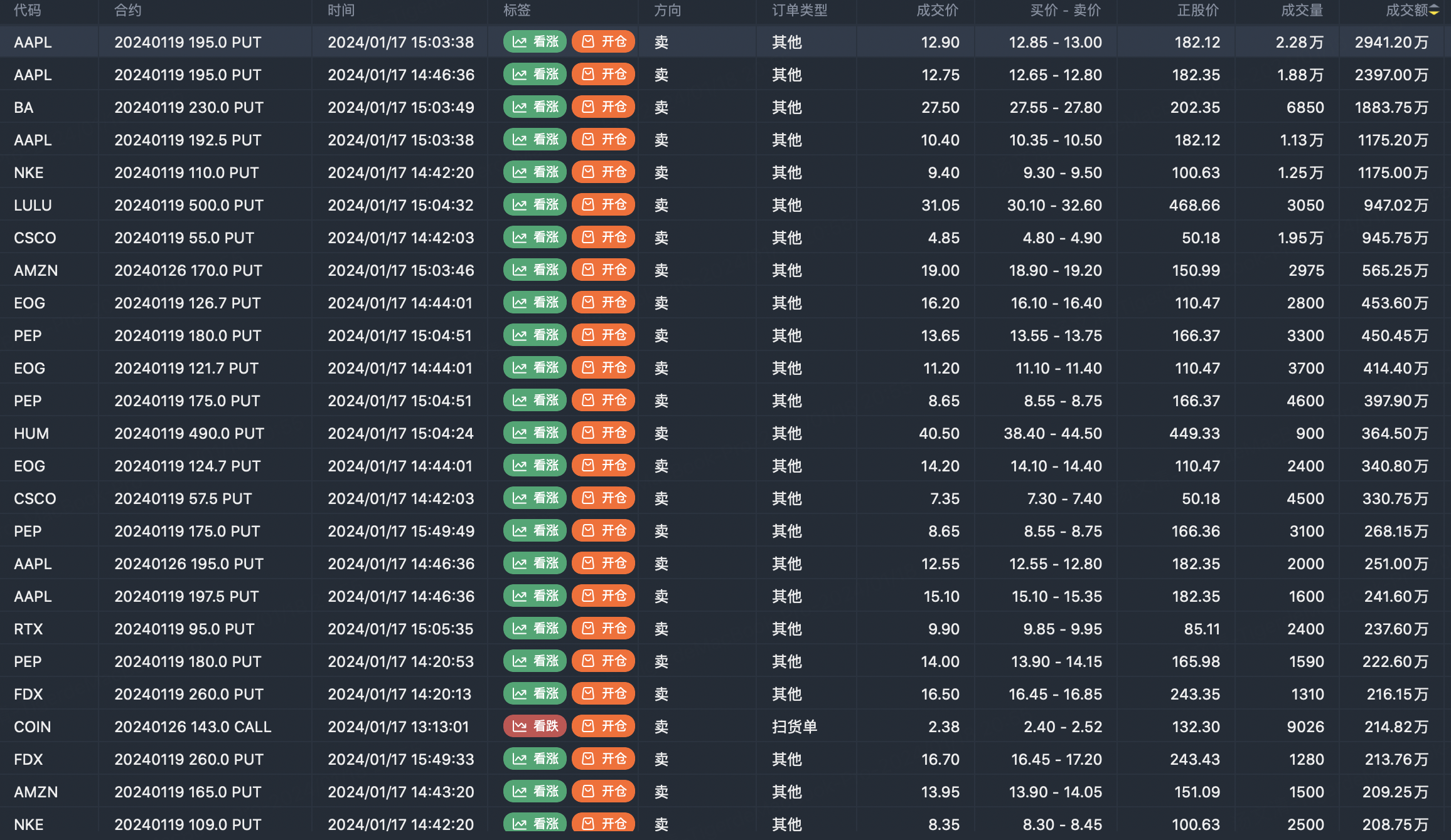 Note: This image data is from Tiger PC. This screen is a significant sell open position for an option contract in the market. A sell of a call option means that the trader believes that the underlying trend has peaked, and a sell of a put option means that the trader believes that the underlying trend has bottomed. These contract openings typically indicate significant activity in the underlying stock, including whether the trader is willing to accumulate a long or short option position.