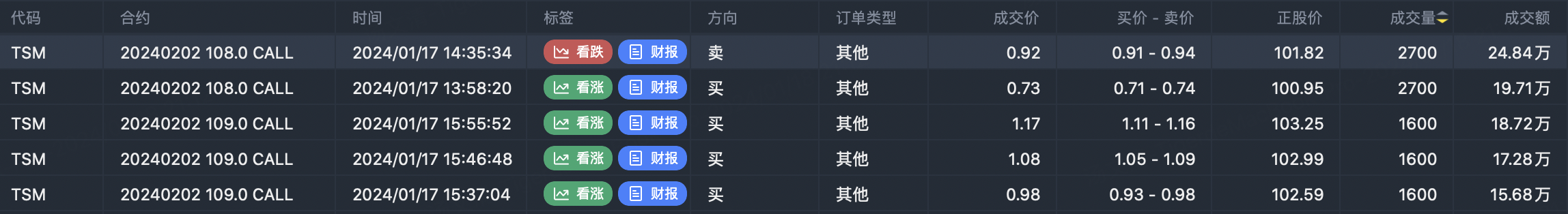 $Taiwan Semiconductor Manufacturing (TSM)$TSMC reported stronger than expected results for the fourth quarter of 2023. The company also expects that driven by AI and HPC demand, the revenue growth in US dollar terms in 2024 will fall in the 20%-25% range, which will be a solid growth year. AI chip advanced packaging demand continues to be strong, the current situation is still unable to meet the strong customer demand, the supply situation may continue to 2025. Institutional bulk buying of TSMC call options before Wednesday's close: $TSM 20240202 108.0 CALL$