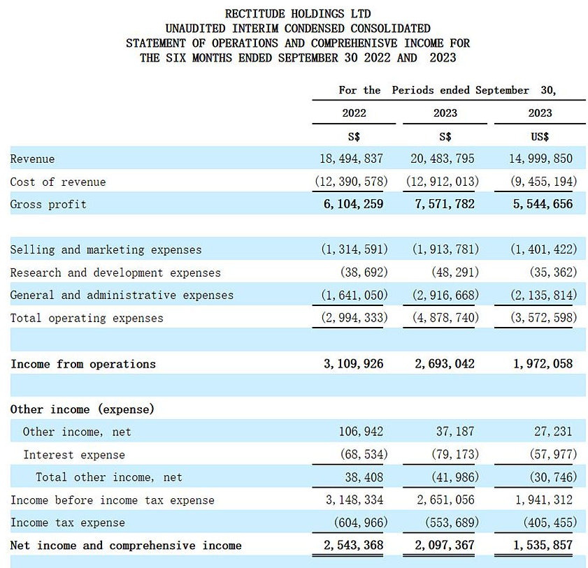 For the fiscal year 2022 (ending March 31), the company had revenues of $29.8 million SGD and a net profit of $2.1 million SGD. For the fiscal year 2023, the company had revenues of $37.6 million SGD (approximately $28.32 million USD), a year-on-year increase of 26.3%; net profit was $3.9 million SGD (approximately $2.95 million USD), a year-on-year increase of 89.1%, with 92% contribution from local Singaporean business.