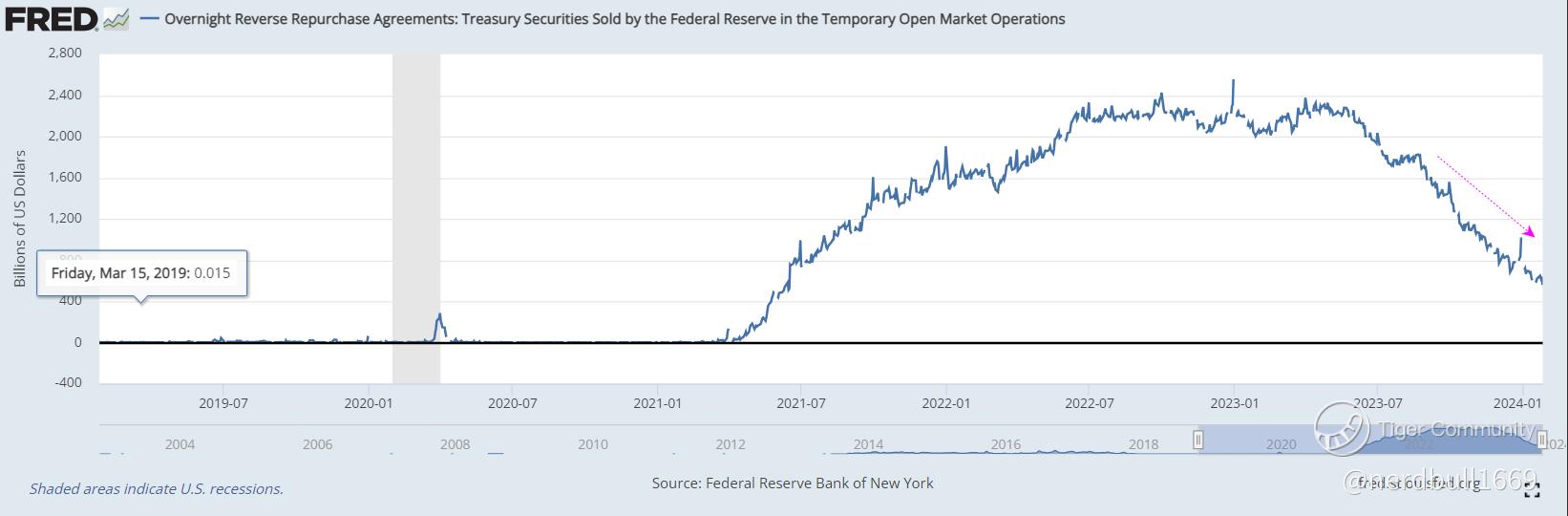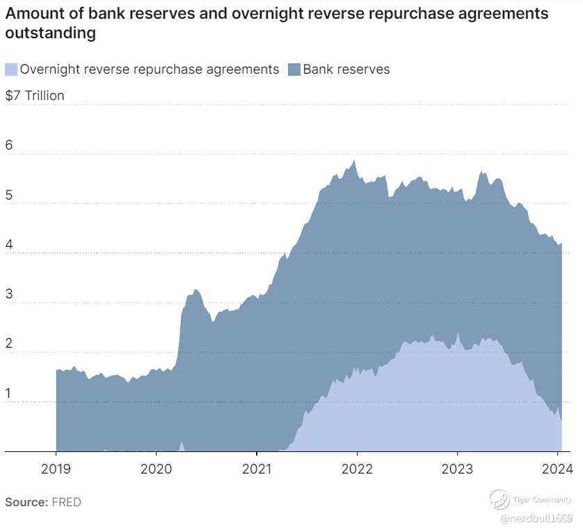 The overall balance sheet size of the Fed has declined from a peak of just shy of $9 trillion in mid-2022 to its current size of $7.7 trillion. The Overnight RRP has declined significantly, as liquidity pressure mounts, ending the balance sheet runoff sooner rather than later could alleviate some of the market's concerns and prevent a repeat of the 2019 “money crunch” crisis.