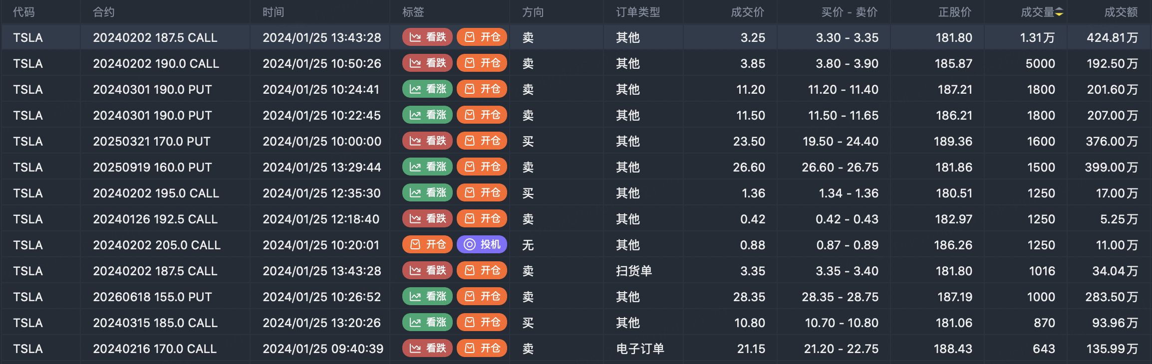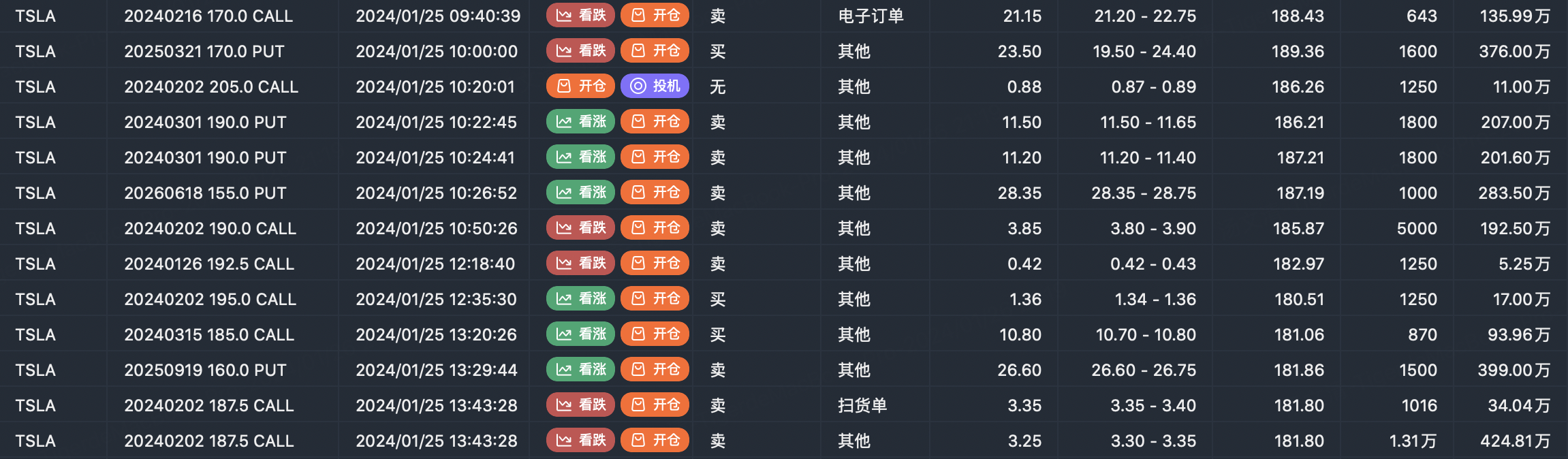 Tesla shares fell 12.13% to close at $182.63 on Thursday. The announcement came after the company reported fourth-quarter results that missed expectations and warned of a marked slowdown in sales growth this year, raising investor concerns about weak demand and competition from Chinese carmakers. Option transactions indicate continued pressure on Tesla's stock price in the near term, with institutions selling large call options orders: $TSLA 20240202 187.5 CALL$