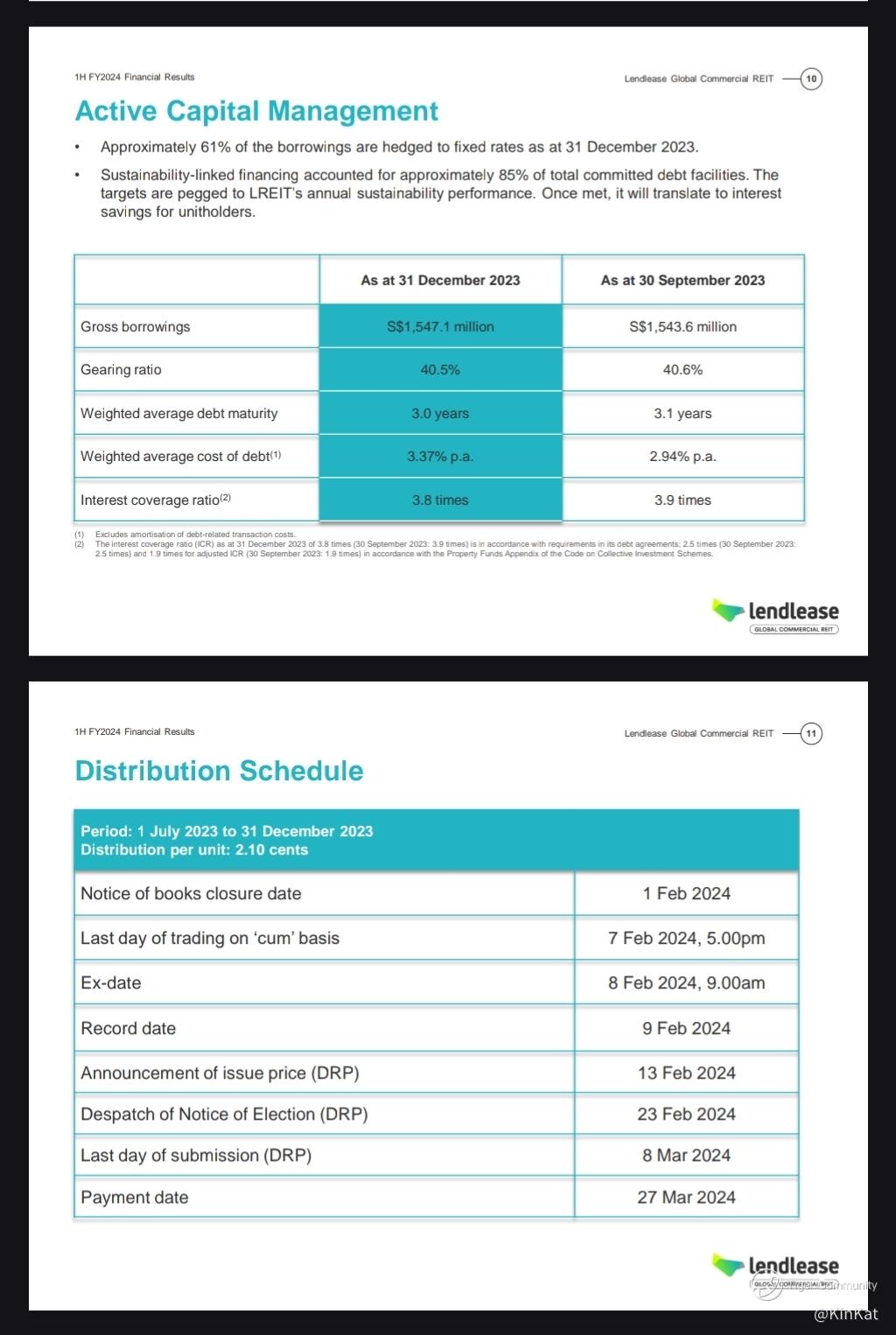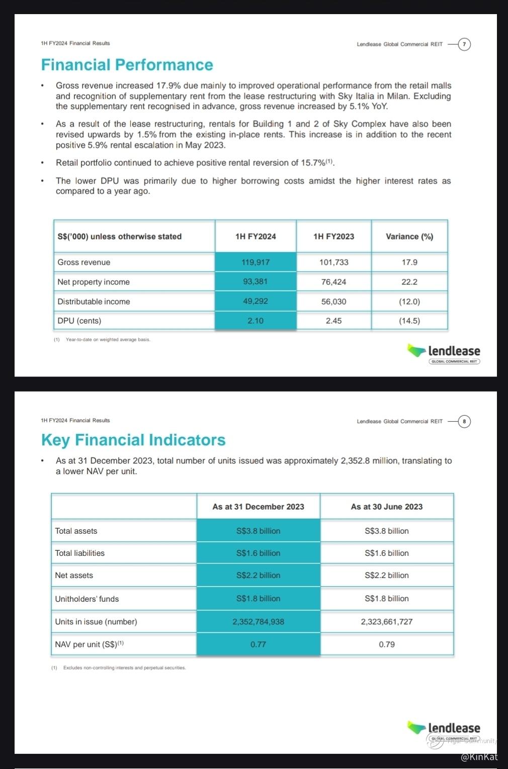 1H24 DPU 2.1ct, -14.5% YoY mainly due to higher cost of Debts (3.37% vs 2.94%), despite higher Revenue (+17.9% YoY) & NPI (+22.2% YoY).