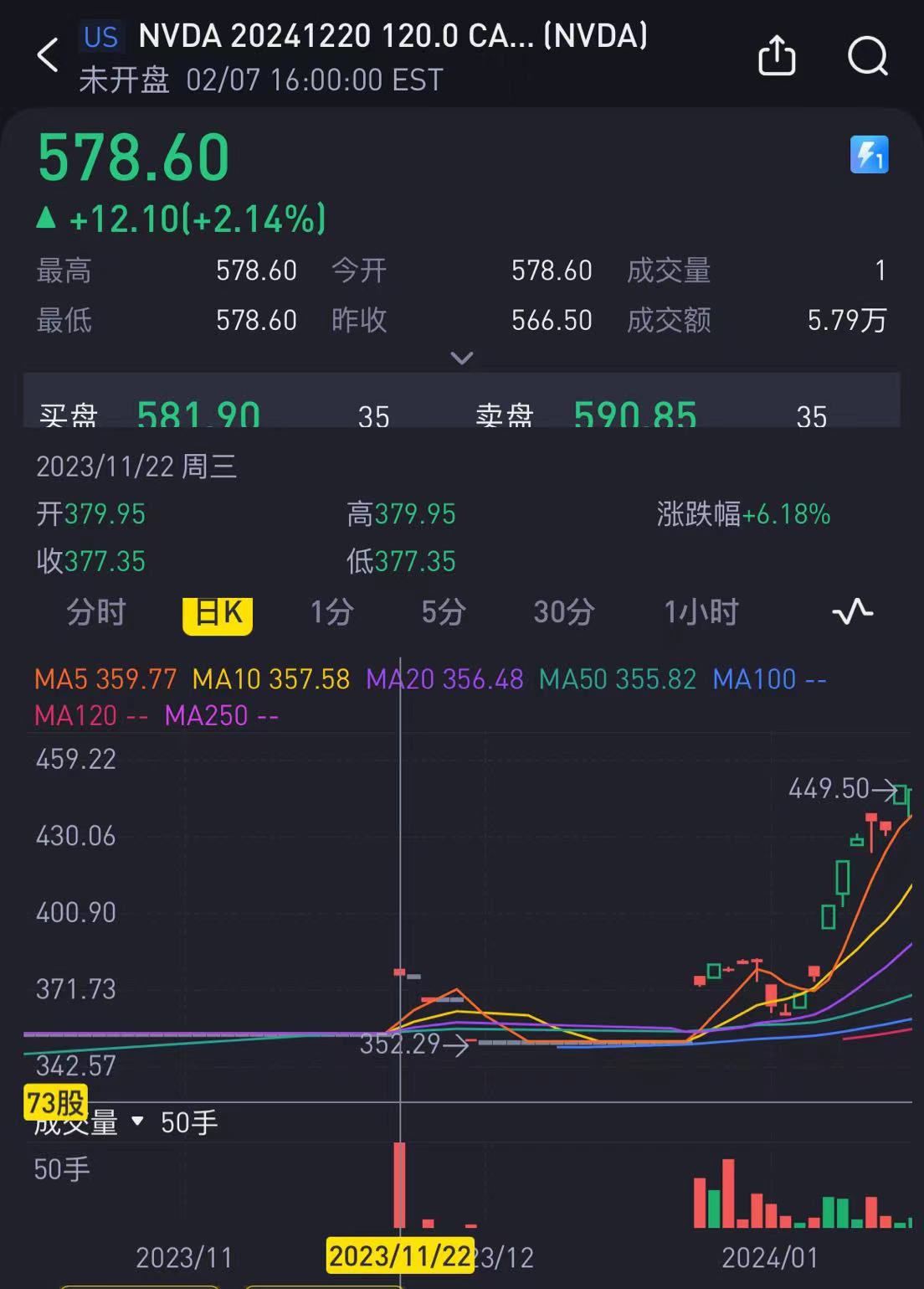 經查閱期權鏈可發現,如圖所示, $NVDA 20241220 120.0 CALL$ 這張期權在11月22日成交量爲50手,而經歷史數據查證當天買入價格爲377.35,總成交額爲188.675萬,跟新聞相佐證。