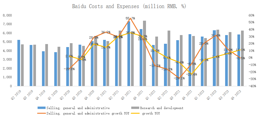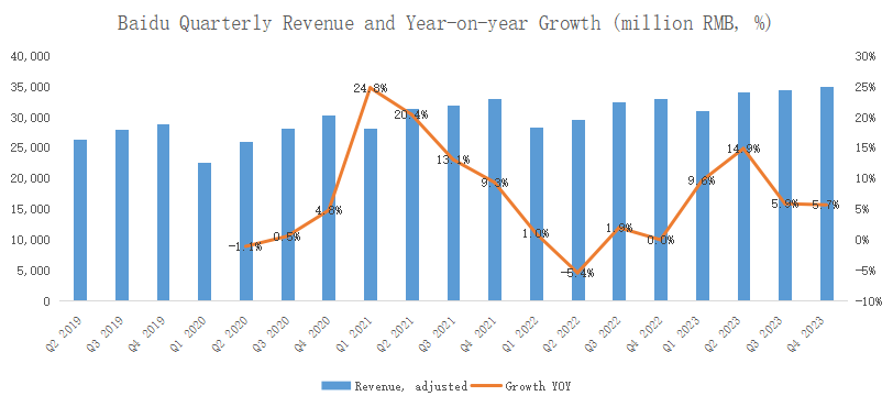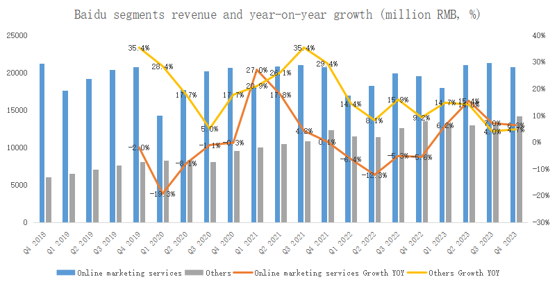 However, the current growth rate of Baidu is really worrying. The impact of the pandemic in the fourth quarter of last year basically disappeared, coupled with the fourth quarter of 2022 coincided with the most serious time of the pandemic, it was also the low point of Baidu's performance. Despite this low base, revenue growth in the fourth quarter of last year was only 5.7%, indicating a loss of growth momentum.
