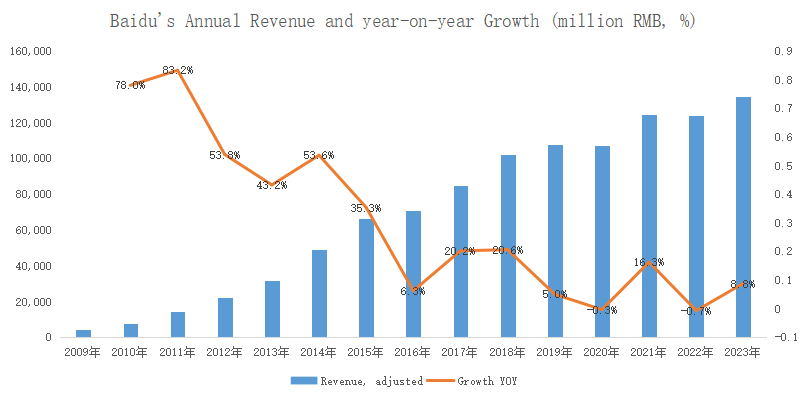 In the whole year of 2023, Baidu's revenue was 134.6 billion yuan, an increase of 8.8% over the same period last year: