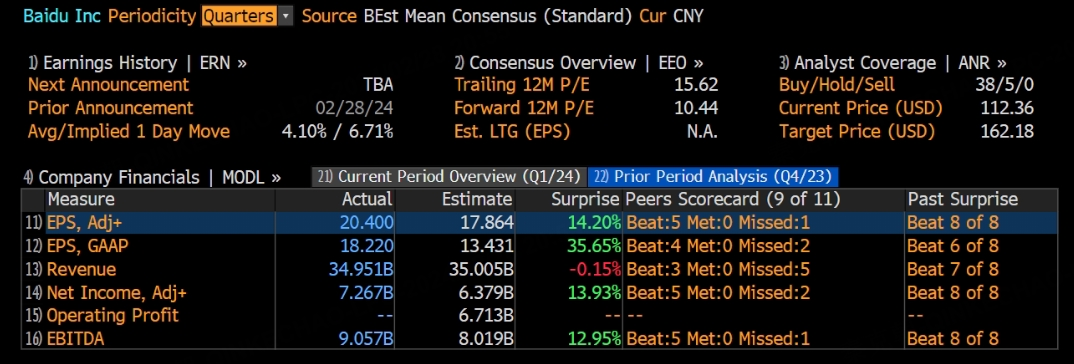 $Baidu(BIDU)$ $BIDU-SW(09888)$ released its fourth quarter report in premarket, with revenue slightly below analysts' expectations: