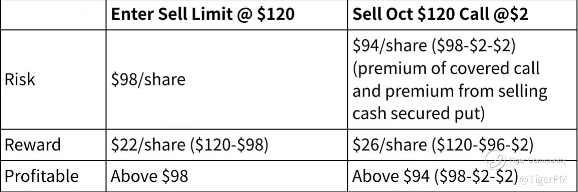 After acquiring the stock from selling the short put, the investor now owns 100 shares of stock $XYZ with a current market price of $98. By selling a covered call at $120, the investor can continue to gain premiums and downsize total cost to $94.