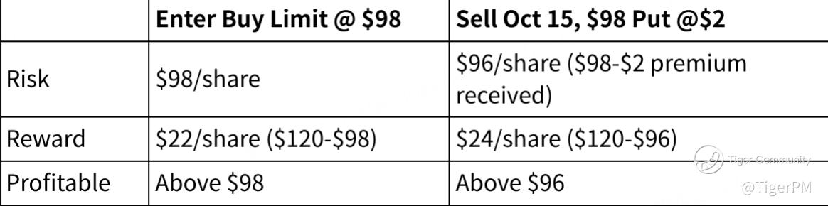Investors should have a neutral/slightly bearish short-term view while having a bullish long-term view. If the strike price is not reached and there is no assignment, the investor will keep the premium received as an income. Cash Secured Puts can be rinsed and repeated each period to generate an income stream. If the stock is acquired at $98, the investor can start selling Covered Calls which allows the investor to sell the stock after a sharp rally to maximize capital appreciation: