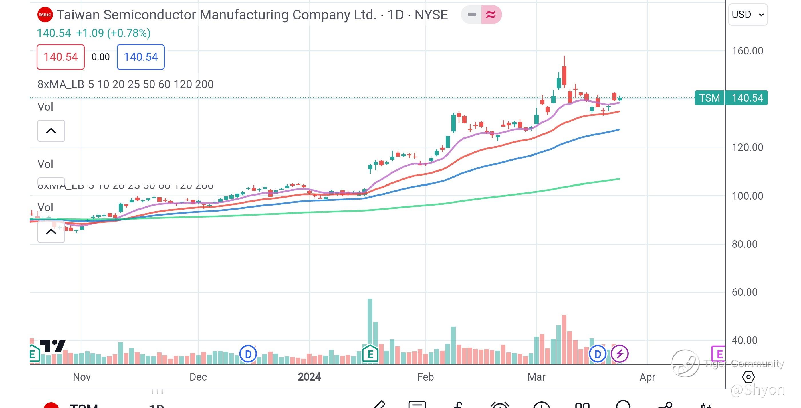 Let's look at TSMC chart, simply bullish with all the EMA facing upwards and share price moves up in a way like a staircase. Extremely bullish formation with healthy pullback each time to the support level of EMa 25 and rebounds. I believe with the big market demand, $Taiwan Semiconductor Manufacturing(TSM)$