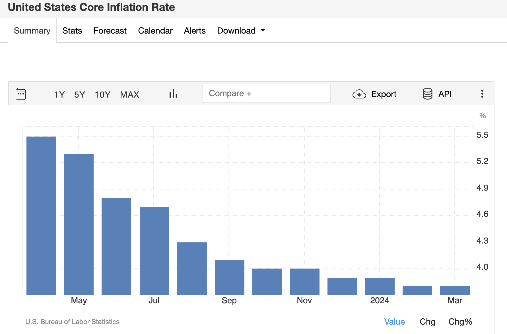 CNBC (https://www.cnbc.com/2024/04/09/stock-market-today-live-updates.html) "The consumer price index in March rose faster than economists had estimated, suggesting stubborn inflation and pushing back expectations for an interest rate cut by the Federal Reserve. The CPI rose 0.4% for the month and 3.5% year-over-year. Economists polled by Dow Jones had forecasted an increase of 0.3% month over month and 3.4% year on year. Core CPI, which excludes volatile food and energy prices, accelerated 0.4% from the previous month while rising 3.8% from a year ago, compared to estimates for 0.3% and 3.7%, respectively."