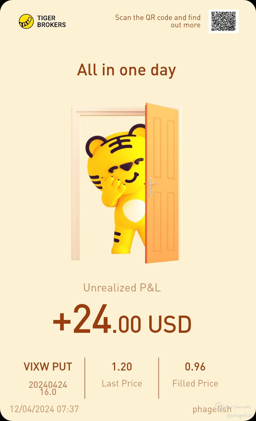 $VIXW 20240424 16.0 PUT$ managed to buy this vid when Vix spiked up above 16. What goes up needs to come down. I have either to hold till expiration, 12 days for Vix to go down further towards recent 13 support. This is cash settled at expiration. Or if it falls to around $13 before expiration, will just close it.