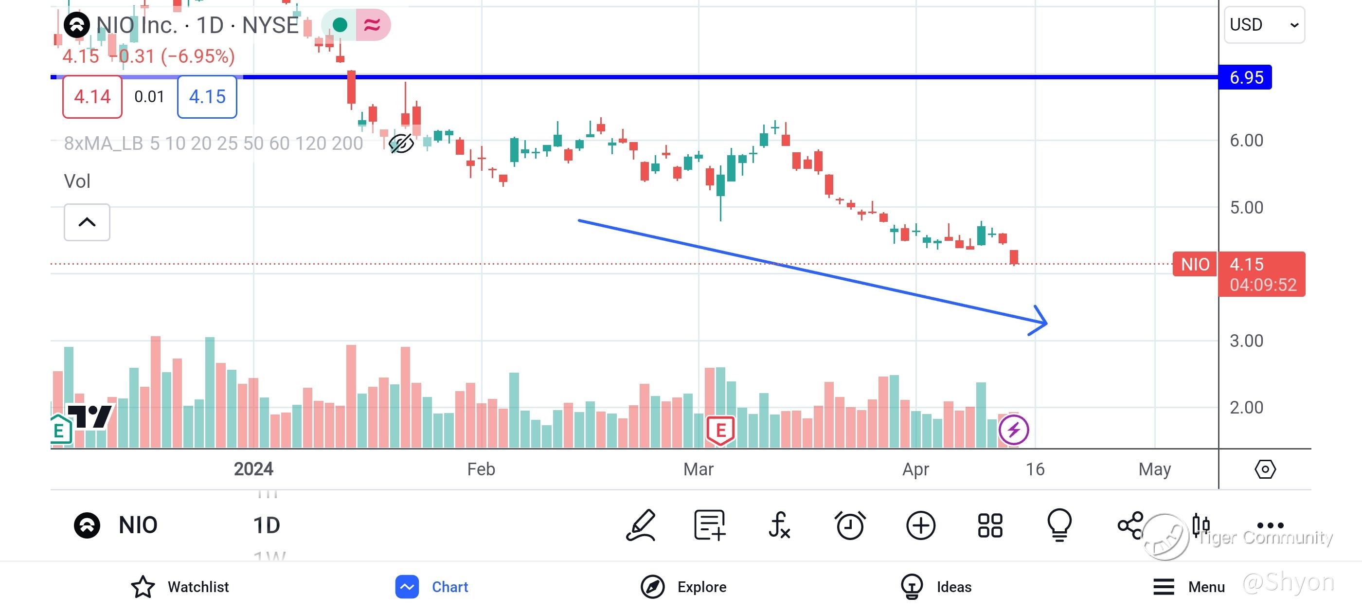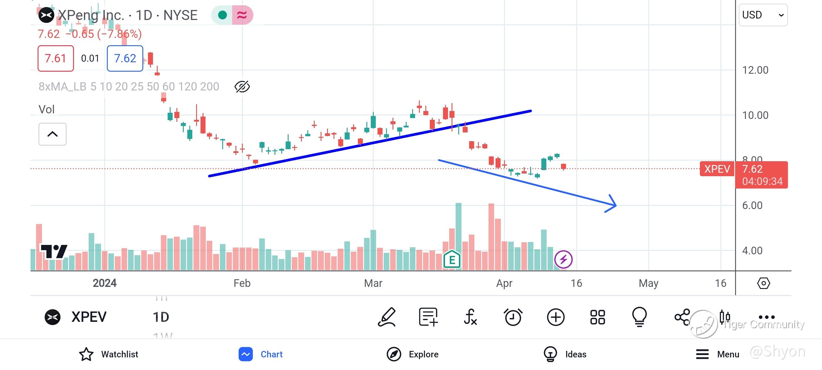We will end today sharing with Chinese Trio, specially on Nio and Xpeng. Similar to all EV makers, Nio and Xpeng are facing tough price war competition as well as soft market demand for their EV. This can be clearly shown through their bearish share price shown below. Both of them are heading towards south, having their share price lowest since beginning of 2024. Therefore, without doubt, bearish vote for both of them! $NIO Inc.(NIO)$