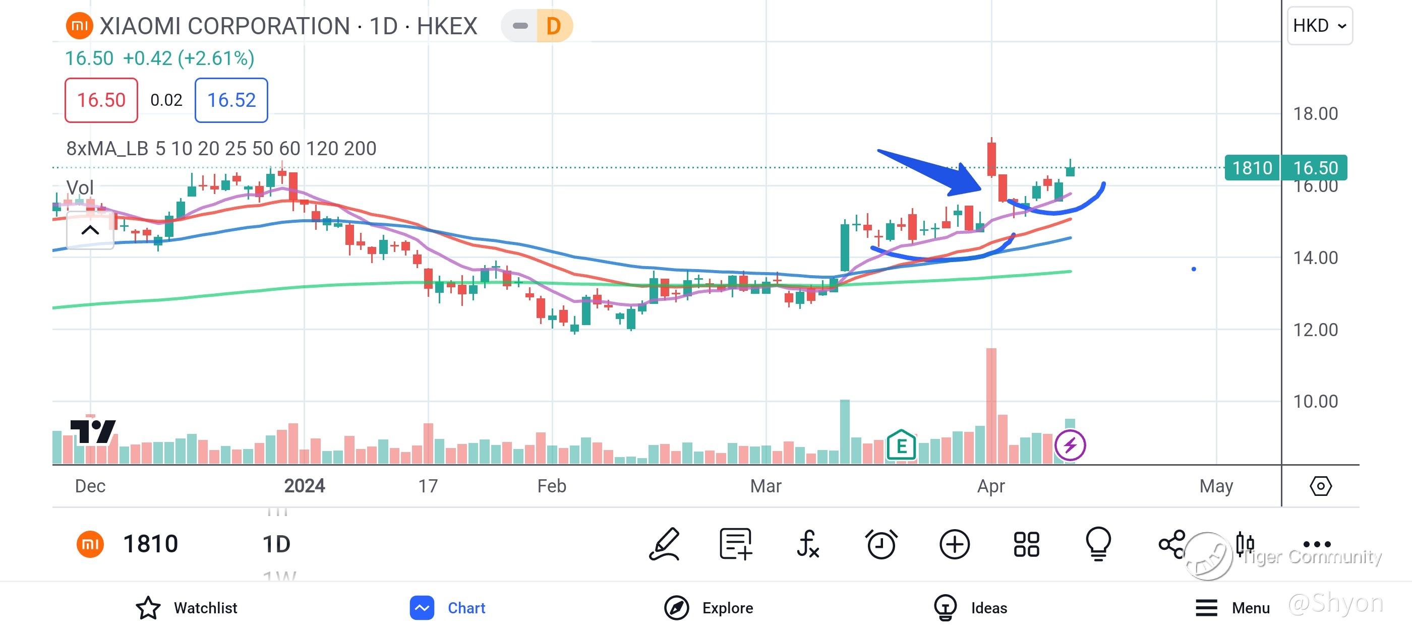 How about the new EV player, Xiaomi? Xiaomi share price gapped up after the launch of its SU7 EV. For the past week, the share price managed to pull back and filled the gap which was a healthy sign. Obvious higher lows can be observed in the chart below as well. For such, I believe Xiaomi $XIAOMI-W(01810)$