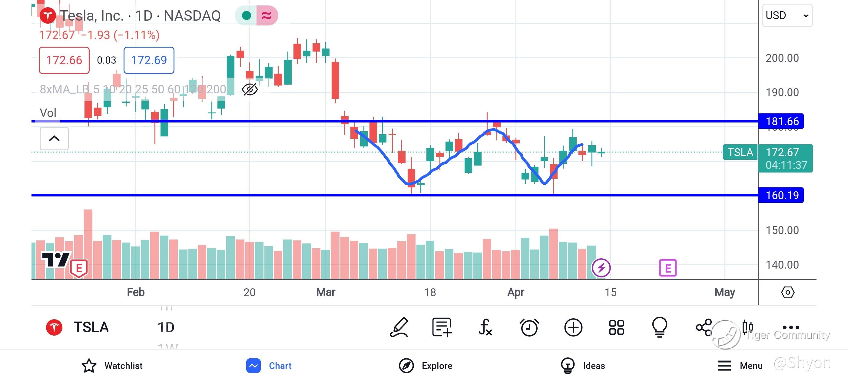 Today, let's analyze a few EV stocks. Since we are discussing about Tesla, let's start with this market leader analysis. Tesla started to have some positive news like FSD and Robotaxi for the past weeks which helped to keep the share price stable as compared to other EV stocks. As we can see in the chart below, Tesla is still consolidating between the range of 160-180 USD. Musk's visit to India might stimulate the share price and rush towards the target of 180 USD $Tesla Motors(TSLA)$
