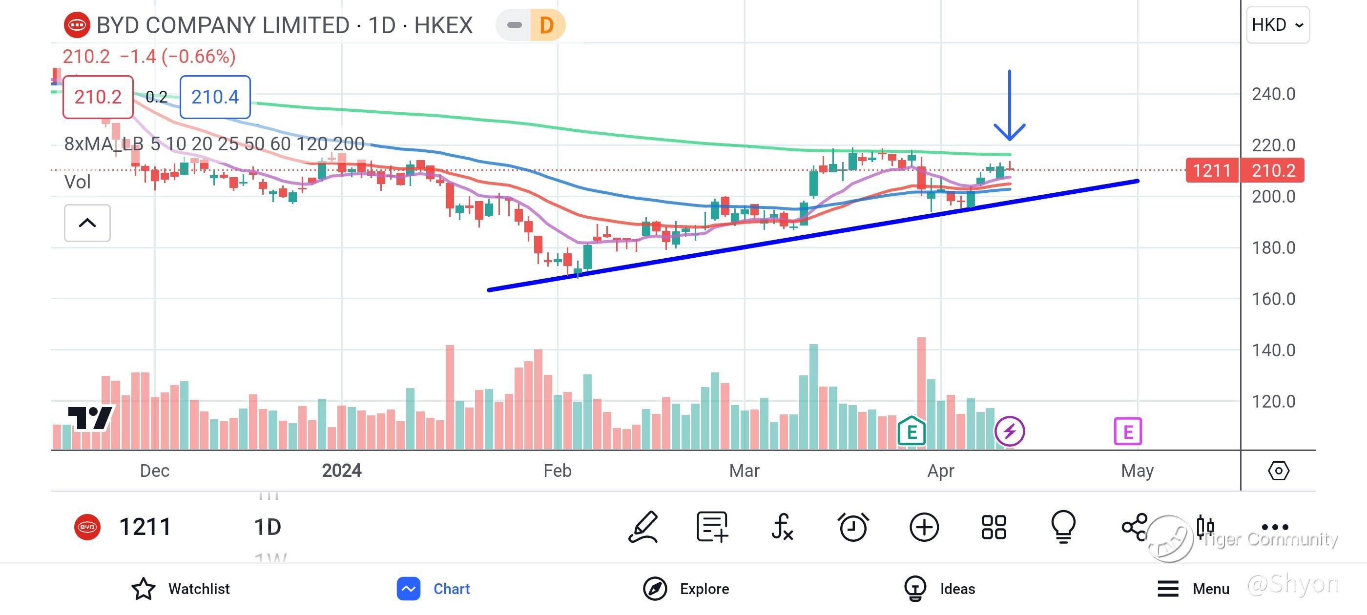 Next, we will look at Tesla's major rival in Chinese market, BYD. Tesla recently reclaimed the title of the world's top EV seller km the first quarter after losing it to BYD last year. However, both the US and Chinese automakers reported a sales decline for the past 3 months as competition intensified in EV market and overall demand softened in China amid economic pressure. Moreover, the share price will soon hit its EMA200 strong resistance which might be challenging to break over in short term. For such, I am$BYD COMPANY(01211)$