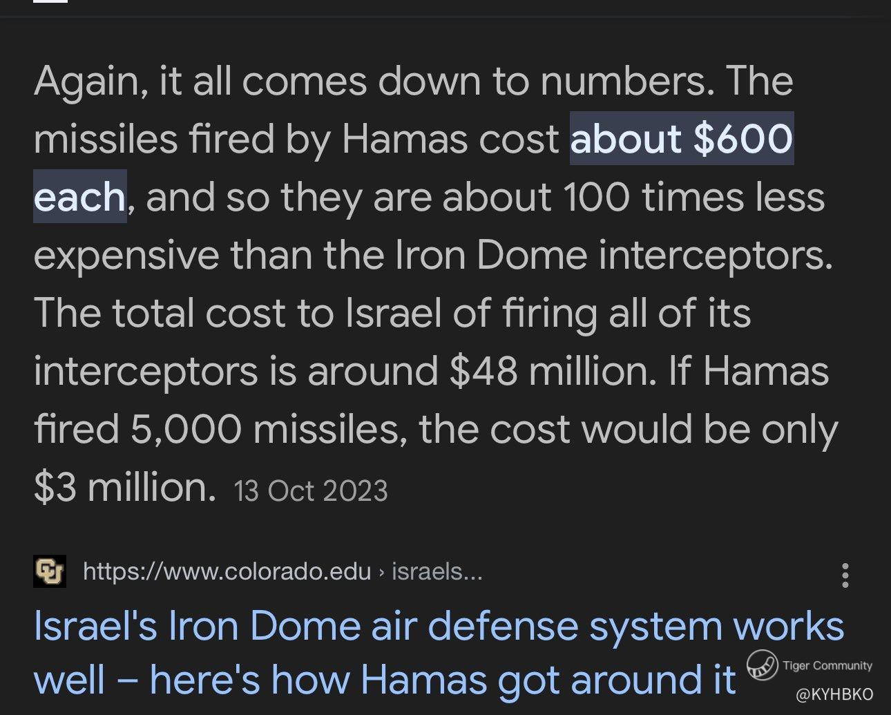 $1B spent by USA and $110M spent by Israel to intercept. It was mentioned that the weapons of Iran cost a fraction of the price of those used by Israel.