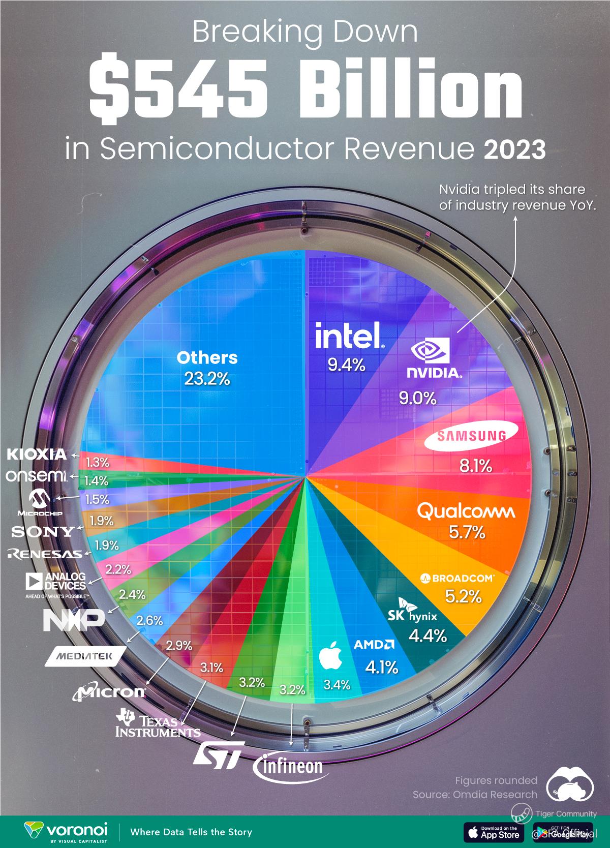 In 2023, Intel led the semiconductor industry with $51B revenue, despite a stock drop due to losses.