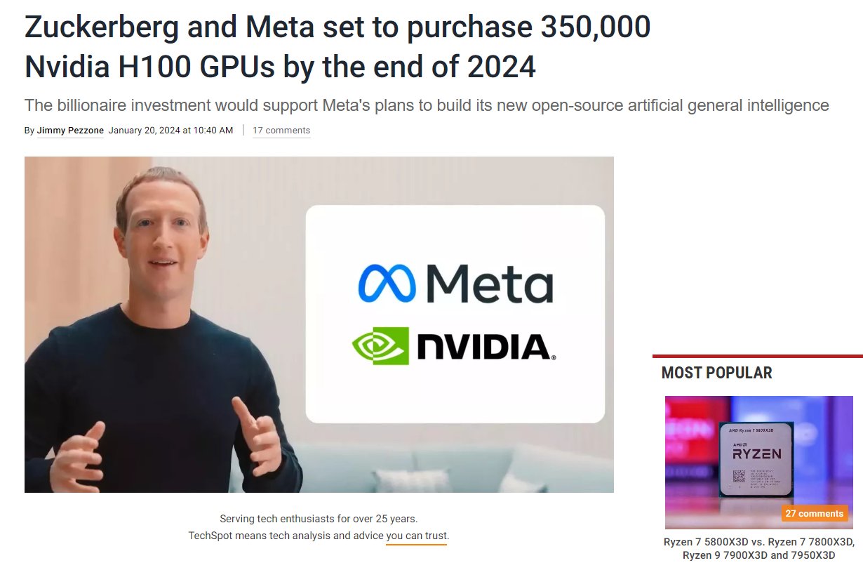 META bought 350,000 chips from NVDA so far and could get to 600,000 chips Guess how much 1 chip cost? Between $25,000 and $30,000 each for the H100 GPU