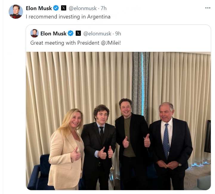Elon Musk's tweet endorsing Argentina and his great meeting with President @JMilei.