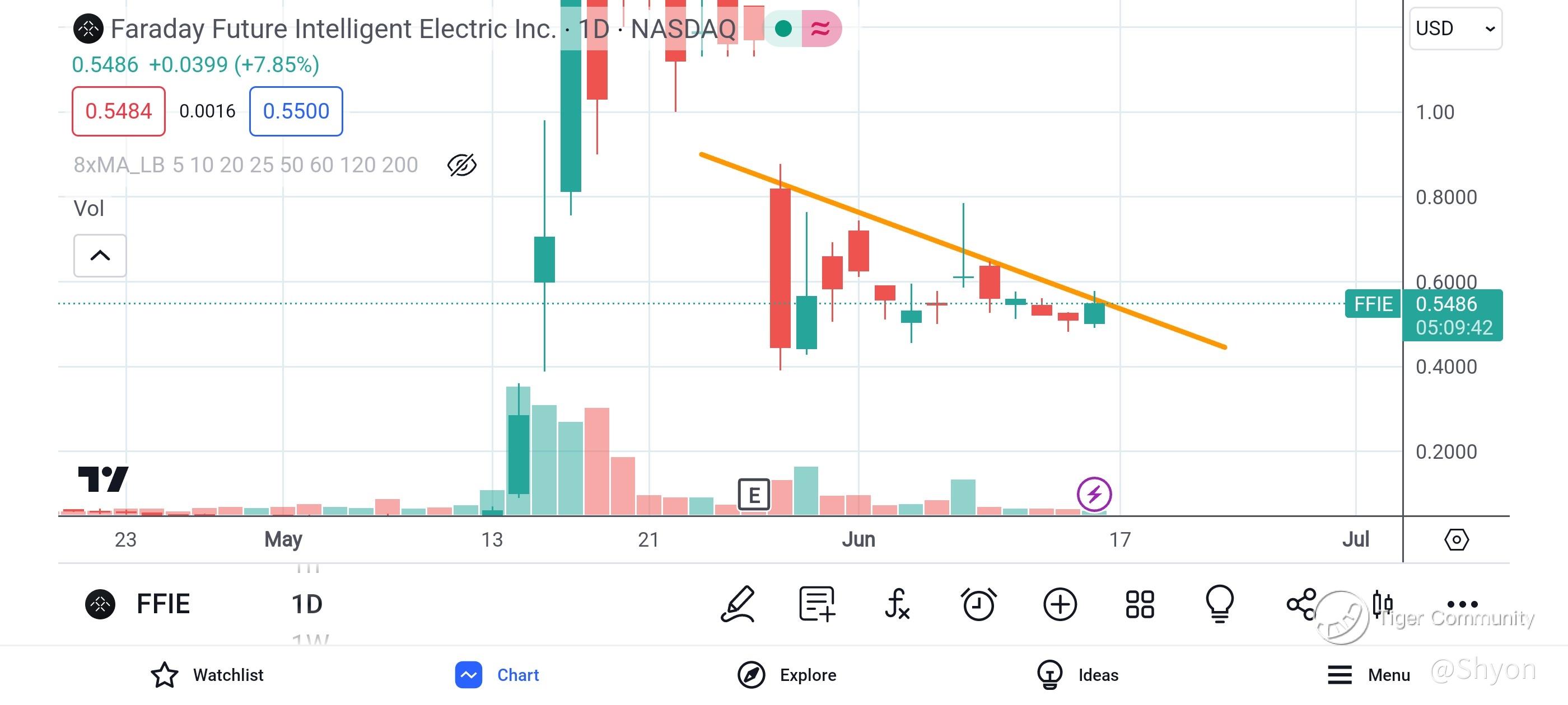 Hard prediction for FFIE trend over the past 2 weeks due to its meme nature and high volatility. The share price seems to be resisted by its downtrend resistance trendline as drawn in Orange in the figure above. Moreover, with its relatively weak share price despite its good news in EV delivery, I believe $Faraday Future Intelligent Electric Inc.(FFIE)$