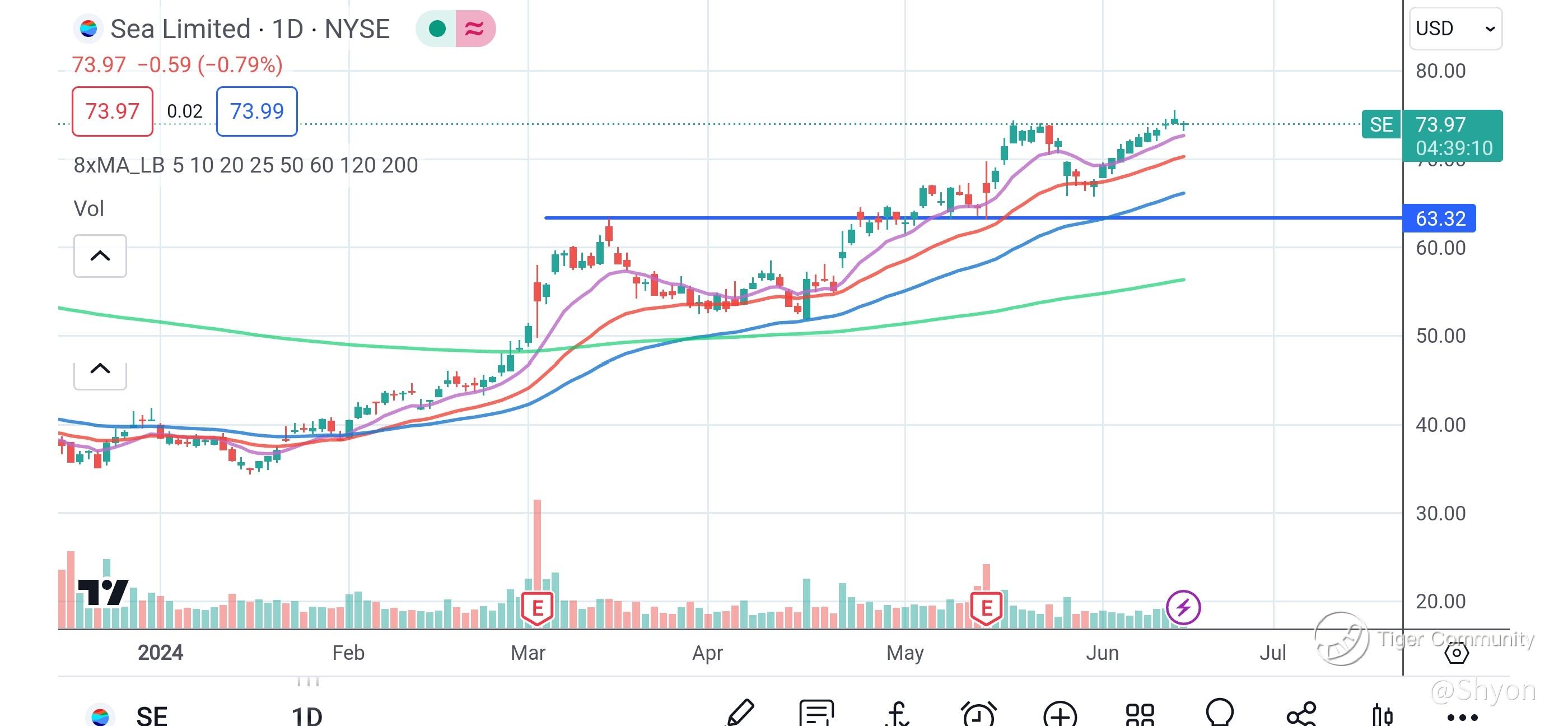 Simply amazing year for SE share price in 2024! An obvious, non stop and bullish uptrend could be observed clearly in the chart above. The recent pullback was perfect, touching EMA25 trendline support and rebounded. For more than 2 weeks, the share price closed green daily. I remain my bullish view on $Sea Ltd(SE)$