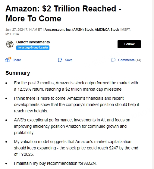 1.An Analyst from seeking alpha stated that “Amazon: $2 Trillion Reached - More To Come”.