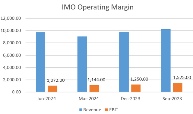 Operating margins have been declining for IMO over the last year. Lower oil prices as the halcyon days of 2022 faded into the drudgery of 2023, reduced output, variances in refining margins, and higher WCS differentials- until recently, are the primary culprits here.