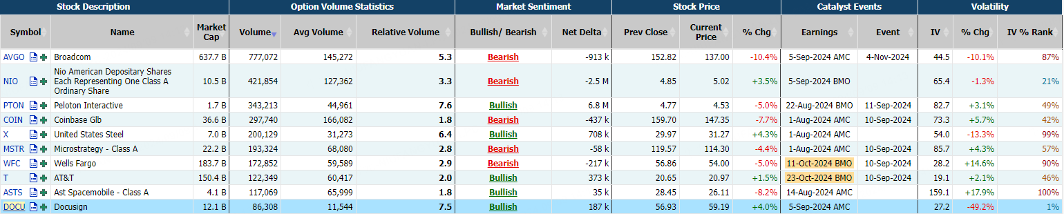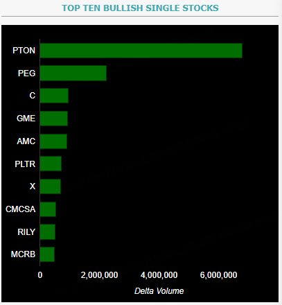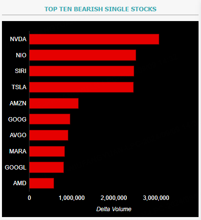 This report shows stocks with the highest volume of bullish and bearish activity by option delta volume, which converts option volume to an equivalent stock volume (bought or sold).