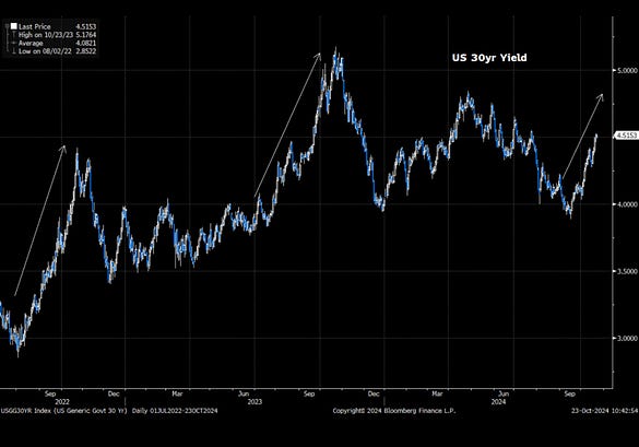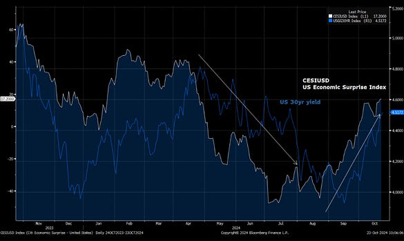 This is a bit of a rehash of a note I wrote back in April but the current conditions seem fitting again as US yields move sharply higher. The turn weaker in the US data from April until August of this year meant that there was renewed demand for bonds as the market began to expect a sharp Fed easing cycle. We have to remember that with the US currently running such large deficits there is constant anxiety about oversupply of US Treasuries that has popped up a couple of times over the last few years. I find it interesting that it has been into 24th October both in 2022 and 2023 that US 30yr yields moved sharply higher and then peaked (this was when fear of inflation/treasury over supply and Fed hawkishness all peaked in both years). These concerns had started to re-emerge in April 2024 but the turn weaker in the US data then drove demand for bonds and we since forgot about these underlying issues. ALTHOUGH… the turn stronger in the US data since then means US yields are on the march higher again so I think it is worth reassessing this. See US 30yr yield and US economic surprise index here: