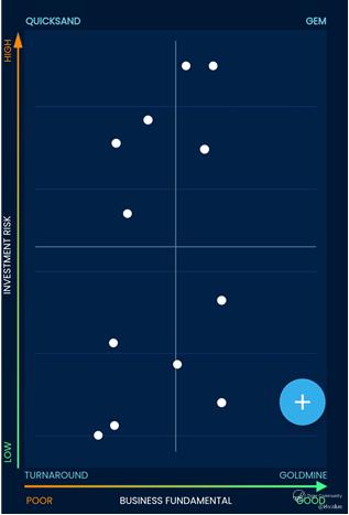 The goal is to hunt for companies in the Goldmine quadrant. These are fundamentally sound companies with low investment risk.