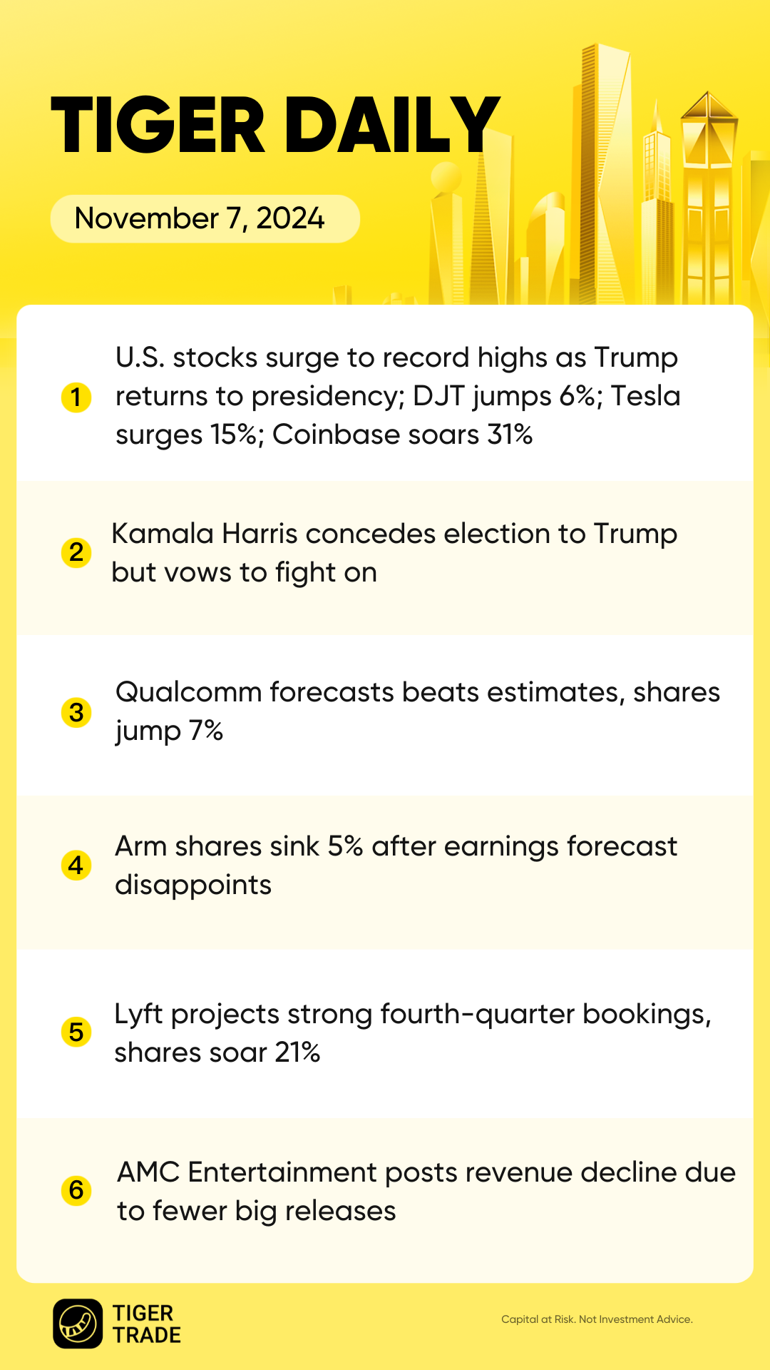 Crypto stocks - Coinbase jumped 31.1%, MicroStrategy gained 13.2%, and Marathon Digital was up 19% after Bitcoin topped $76,000, a record high, as Trump declared victory.