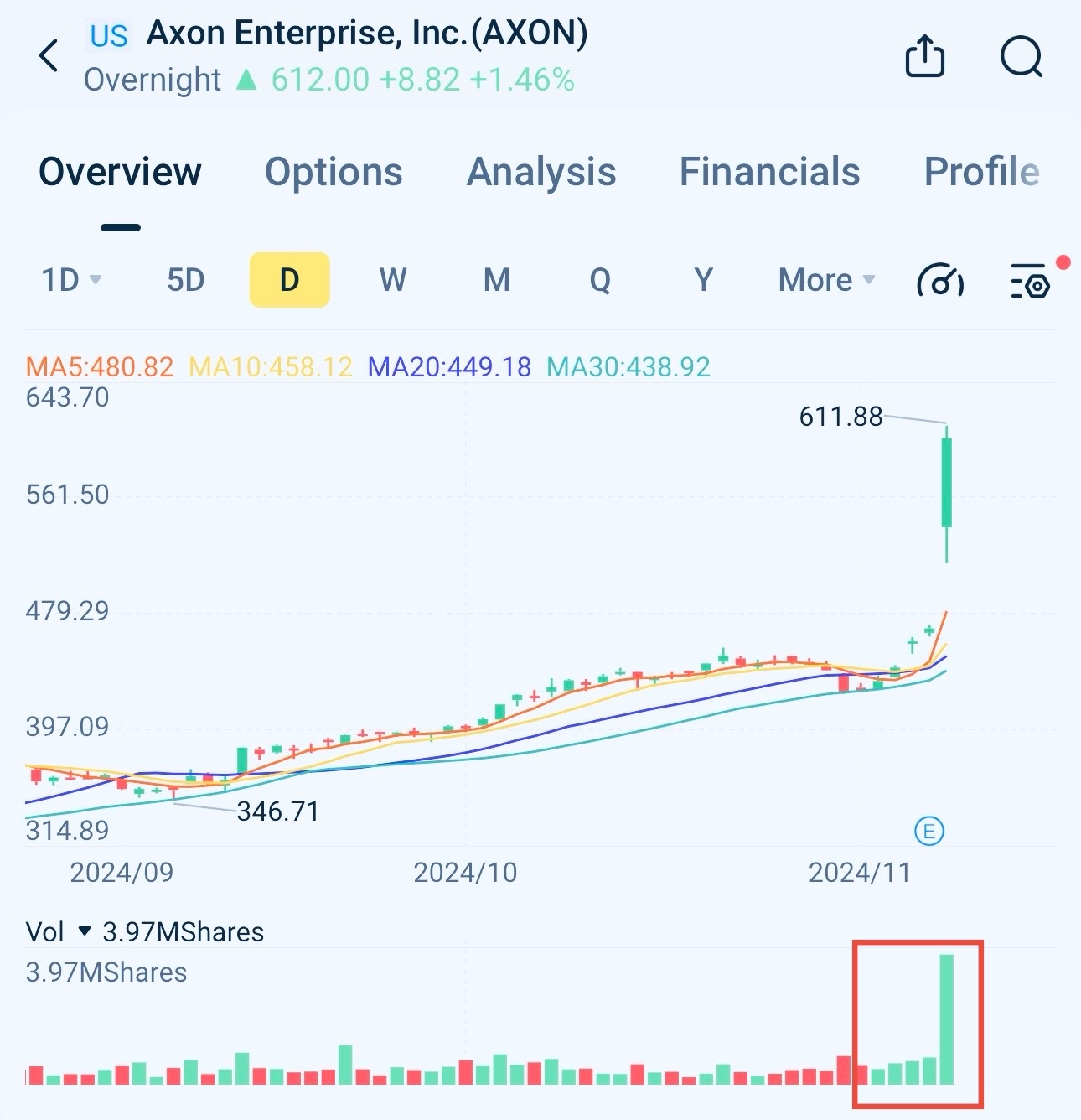 $Axon Enterprise, Inc.(AXON)$ : Trading volume has been steadily increasing and has recently surged significantly, leading to a price breakout. The bullish momentum is strong, making it worthwhile to continue monitoring the stock for the best buying opportunity.