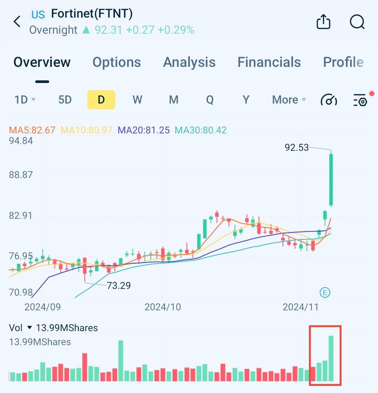 $Fortinet(FTNT)$ : The stock price has risen in tandem with increasing trading volume and has decisively broken through the resistance level established by the previous price high. Now, we await a modest pullback, after which there will likely be opportunities to trade.