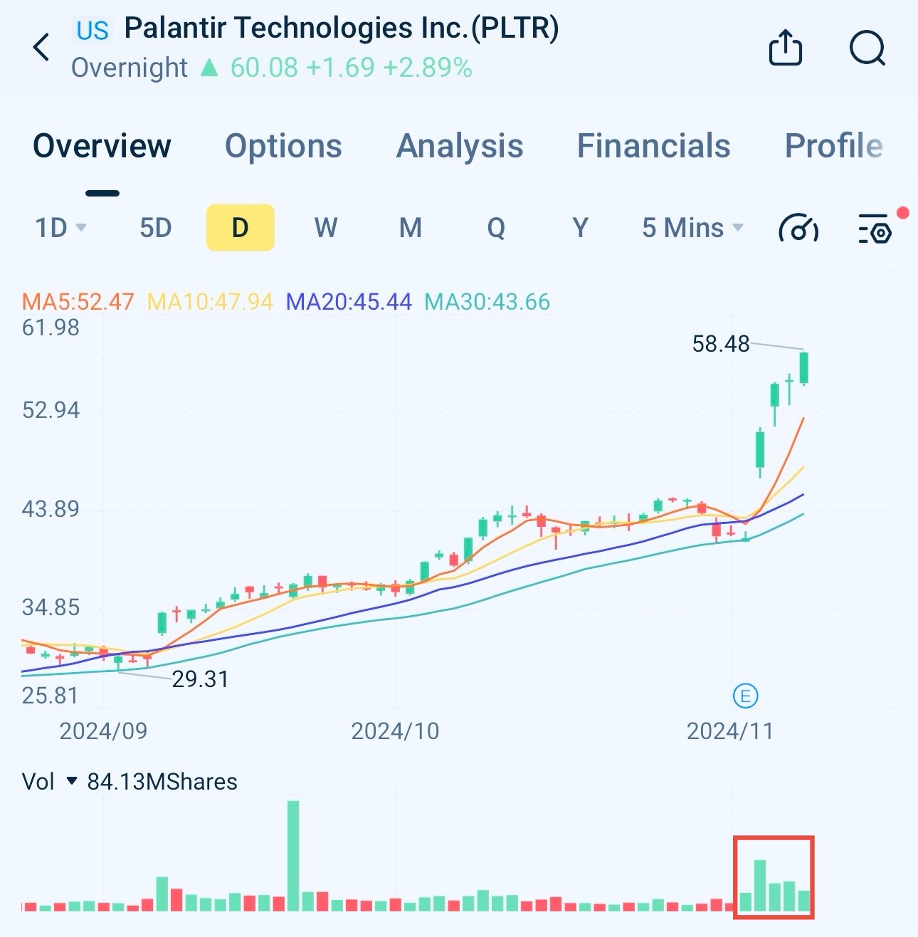 $Palantir Technologies Inc.(PLTR)$ : The stock price has been on a steady rise, but the trading volume has shown an opposite trend, declining day by day. This drop in volume, coupled with the increasing price, suggests a diminishing value proposition. Large-cap stocks require a significant amount of capital, which can limit their price increases. However, as a market bellwether, PLTR reflects investor sentiment and reinforces the prevailing trading styles and risk appetites in the market.