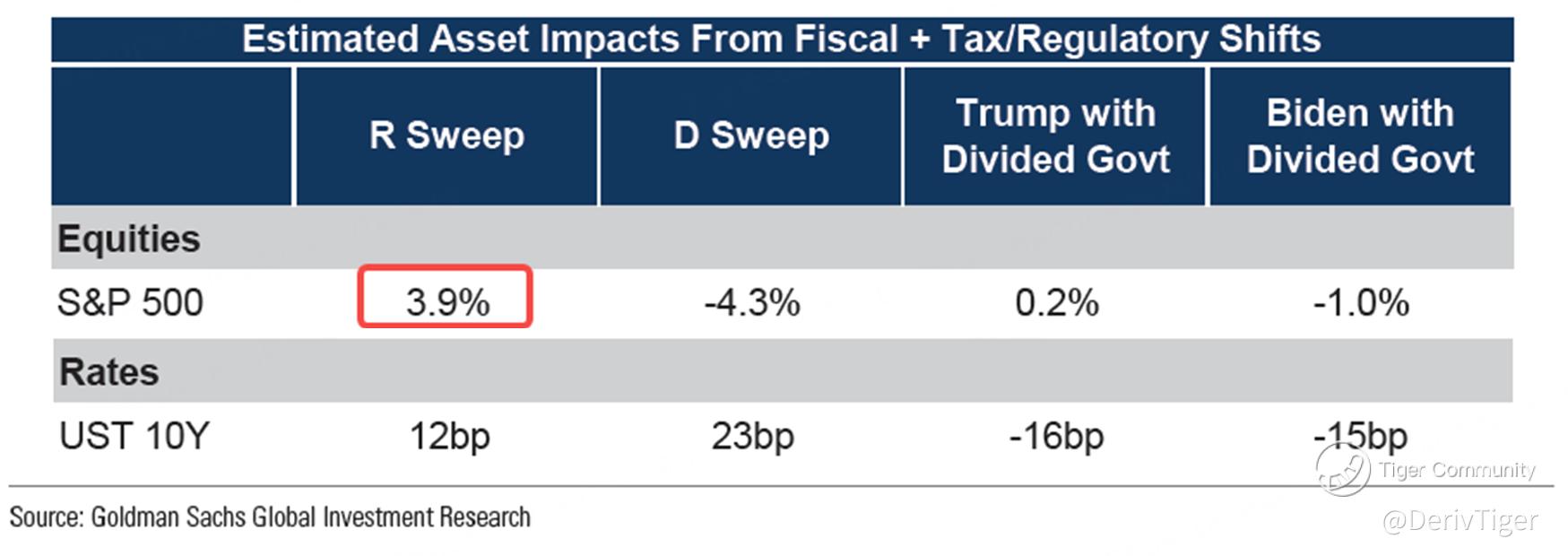 The impact of the election result quickly reflected across U.S. equity markets. In the past week, the S&P 500 $标普500(.SPX)$ and Nasdaq posted gains of nearly 5%, while the Russell 2000 small-cap index surged by 8%. This is partly due to the removal of election-related uncertainties, reducing market risk and volatility. More importantly, Trump’s core policy framework of "tax cuts + deregulation" is inherently supportive of corporate profitability. According to Goldman Sachs estimates, fiscal and tax policies could add 3.9% to the S&P 500’s value.