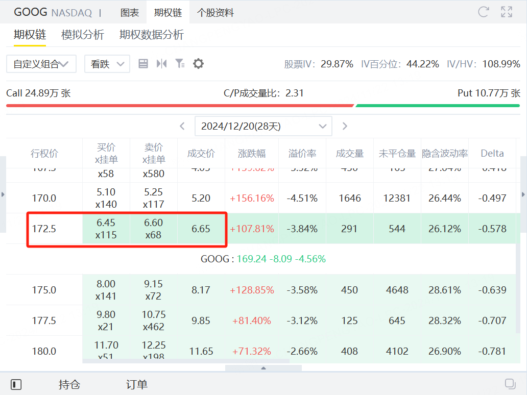 看多谷歌的投資者可以賣出到期日爲12月20日,行權價爲172.5美元的看跌期權,獲得權利金665美元。