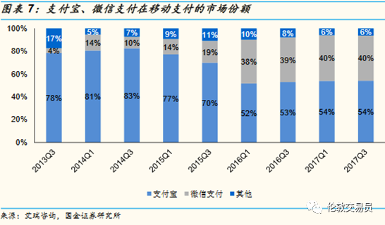 自此之後,巨頭們又將支付戰爭轉移到了下一批交易場景,如外賣、新零售等。雖然阿里與騰訊之間的支付戰爭還在繼續,但重心已不在於此了(本系列的主題爲"金融科技",關於巨頭間生態爭奪的討論得另開一期)。