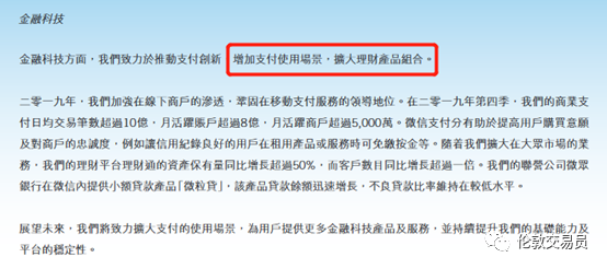 圖:騰訊的2019年年報,裏面也只提了支付和理財業務,幾乎沒提起信貸業務。這一點和螞蟻的招股書信息大相徑庭。