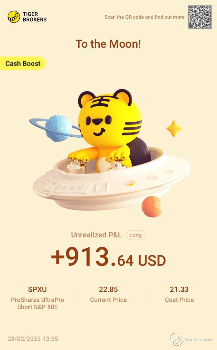$ProShares UltraPro Short S&P 500(SPXU)$ Going all-in pays off! When the market presents an opportunity, taking decisive action is key. This round of gains was absolutely worth it—proving that conviction matters. The momentum is still there, so let’s keep pushing forward!