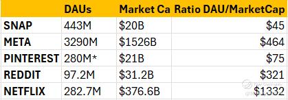 For any user-based network, I prefer to value them using a metric I refer to as "market cap per user." The rationale behind this approach is that when evaluating a social network's core fundamentals, the most important factors are the number of users it has and the value it provides to them. This value can be measured in terms of time spent or other relevant metrics.
