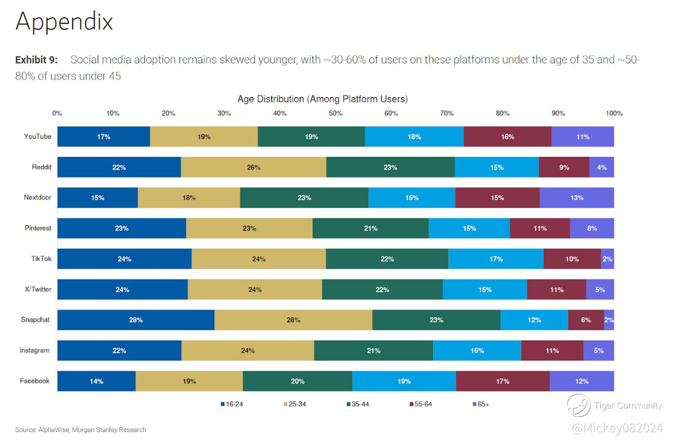 What stands out to me is that Snap has managed to grow its DAUs from the end of 2019 to today, despite this period coinciding with the meteoric rise of TikTok. TikTok presents a bigger competitive threat to Snap than Meta, as its key demographic—particularly at the start of this period—overlapped with Snapchat’s: teens and young adults. This growth trend indicates that, while TikTok is widely used by younger audiences, they continue to engage with Snapchat as well, showing that TikTok hasn't fully replaced Snapchat. The shift in usage trends over the past few years reveals that users typically turn to TikTok for entertaining content from unfamiliar creators, while Snapchat is primarily used for connecting and interacting with friends. The lines are becoming increasingly blurred as both platforms expand into each other’s territories—Snap with Spotlight and TikTok through features like Lemon8. While TikTok is gaining popularity among older demographics, it is starting to resemble Meta’s Instagram, as highlighted in this table: