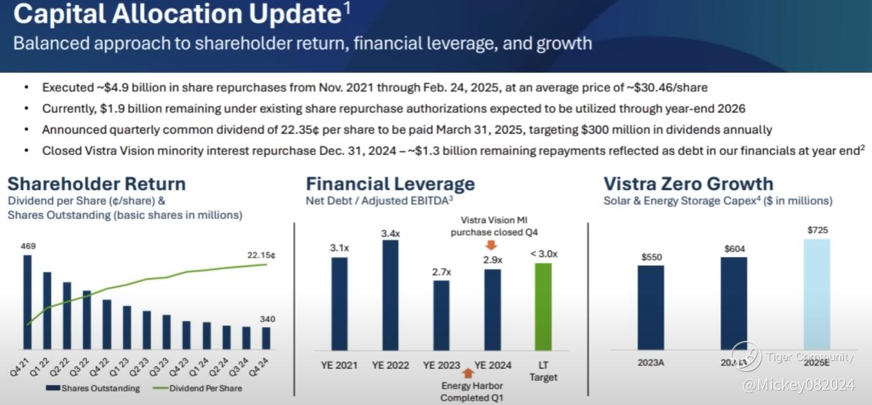 Vistra is using its strong cash flow for both growth investments and shareholder returns. The company has executed nearly $5 billion in share repurchases since November 2021, at an average price of $30 per share—below current levels. As shares are reduced, dividends per share naturally increase.
