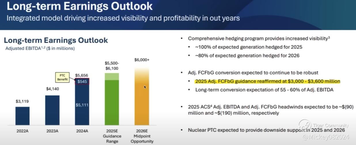 Vistra's long-term earnings outlook has significantly improved, with EBITDA rising from approximately $3 billion in 2022 to a projected $6 billion+ by 2026. A large portion of this is expected to convert into free cash flow, estimated between $3 billion and $3.6 billion annually.