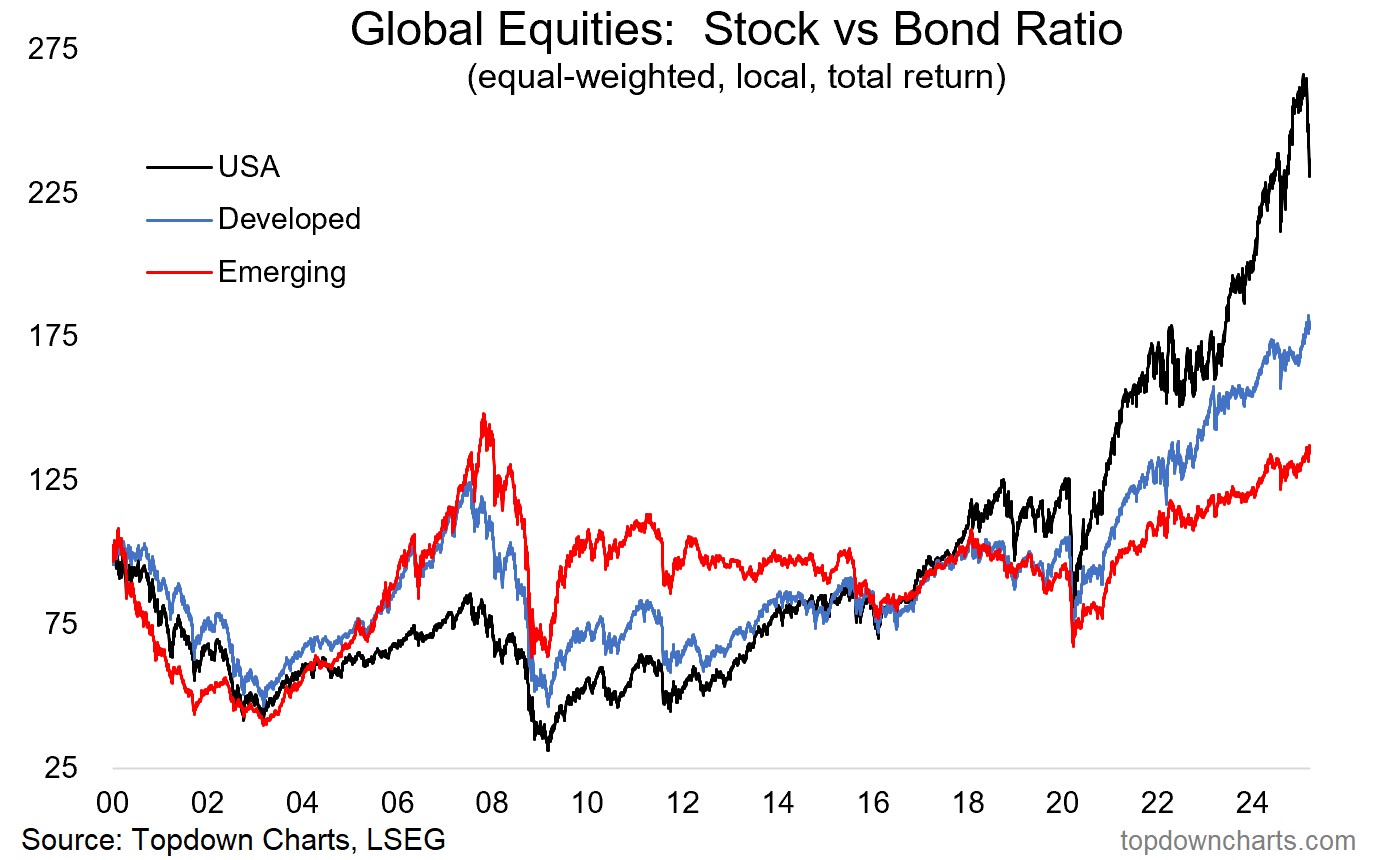 If you look at global markets, the trend we see in emerging markets and developed markets ex-US is that the stock/bond ratio is actually moving higher. Europe and China are stimulating their economies and turning up out of slowdown, things are really changing in Japan, and even LatAm is looking good —much of the world’s stockmarkets are going up and enjoying a weaker USD and rotation flows out of US into global markets.