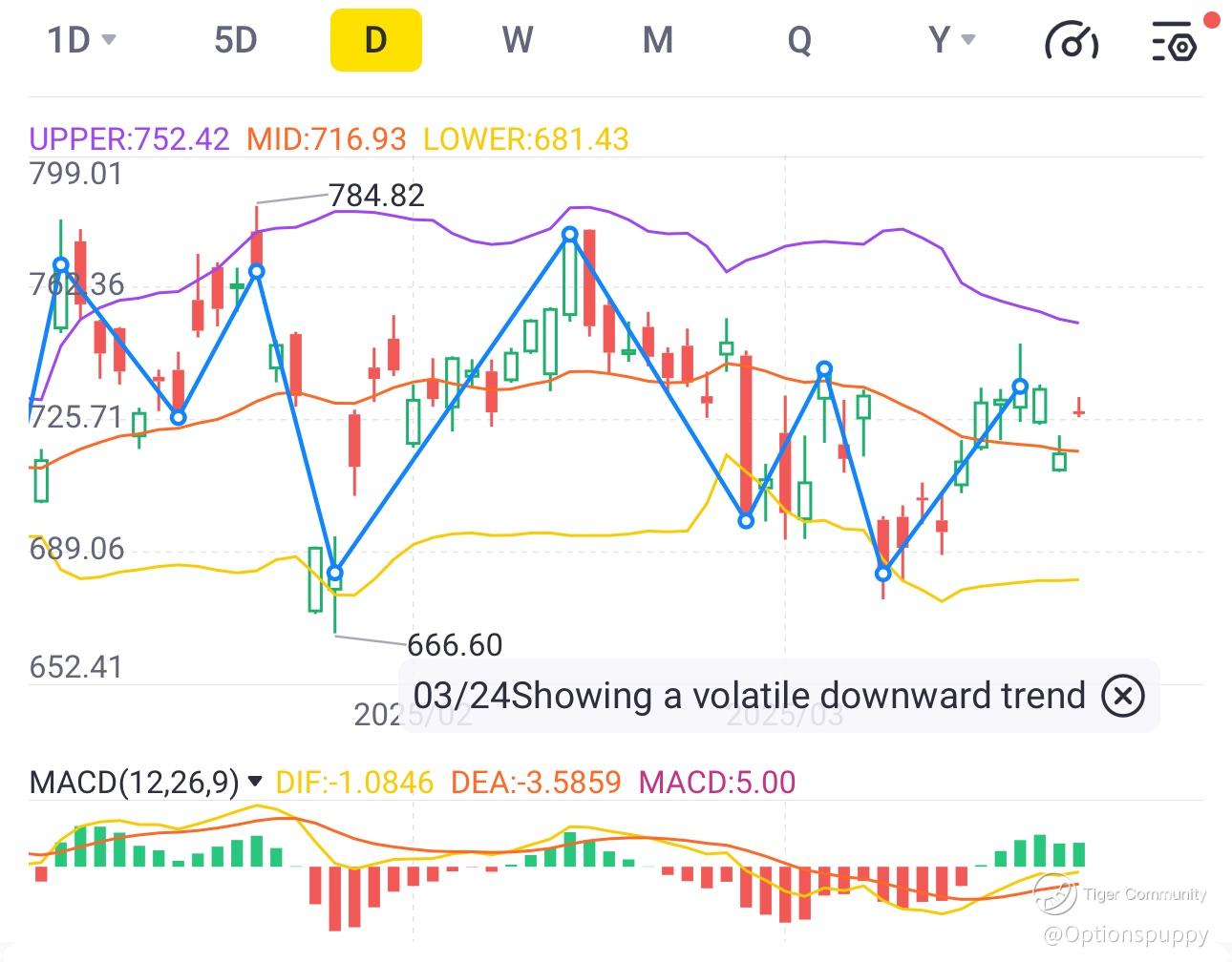 • The stock recently bounced from the lower Bollinger Band (681.43), which often acts as a support level.