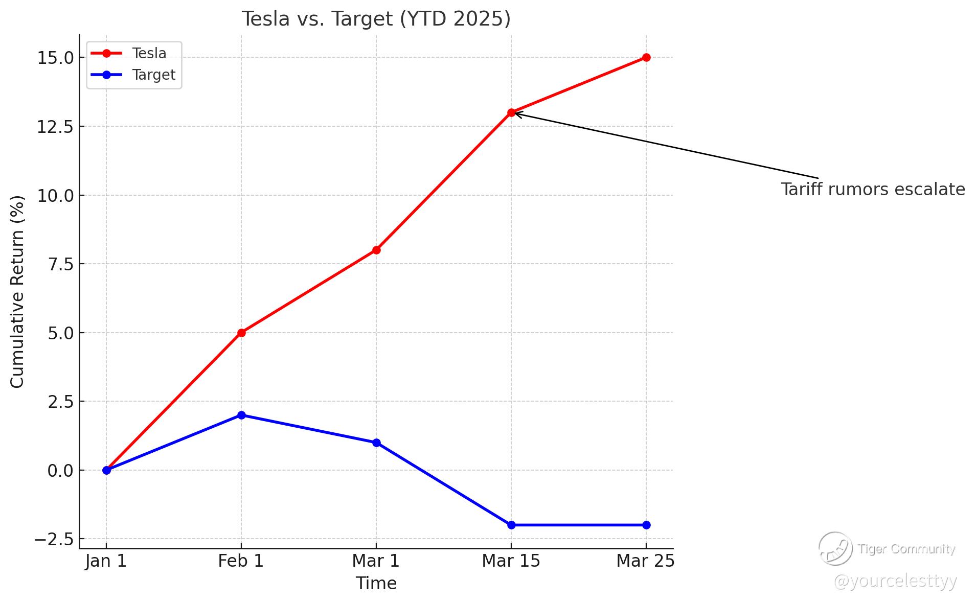 This graph would highlight the tariff divide—Tesla climbing as Target sinks—a stark visual of sector dynamics.