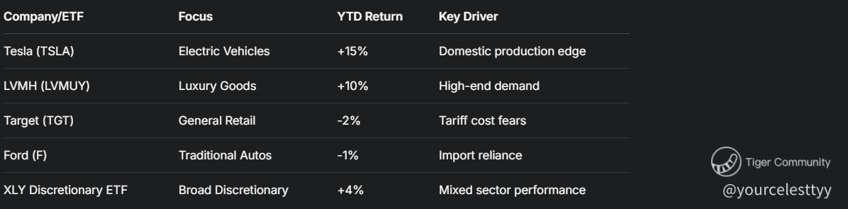 The table shows a clear divide: tariff-proof names like Tesla and LVMH are thriving, while import-dependent Target and Ford lag. It’s a tale of resilience versus risk.