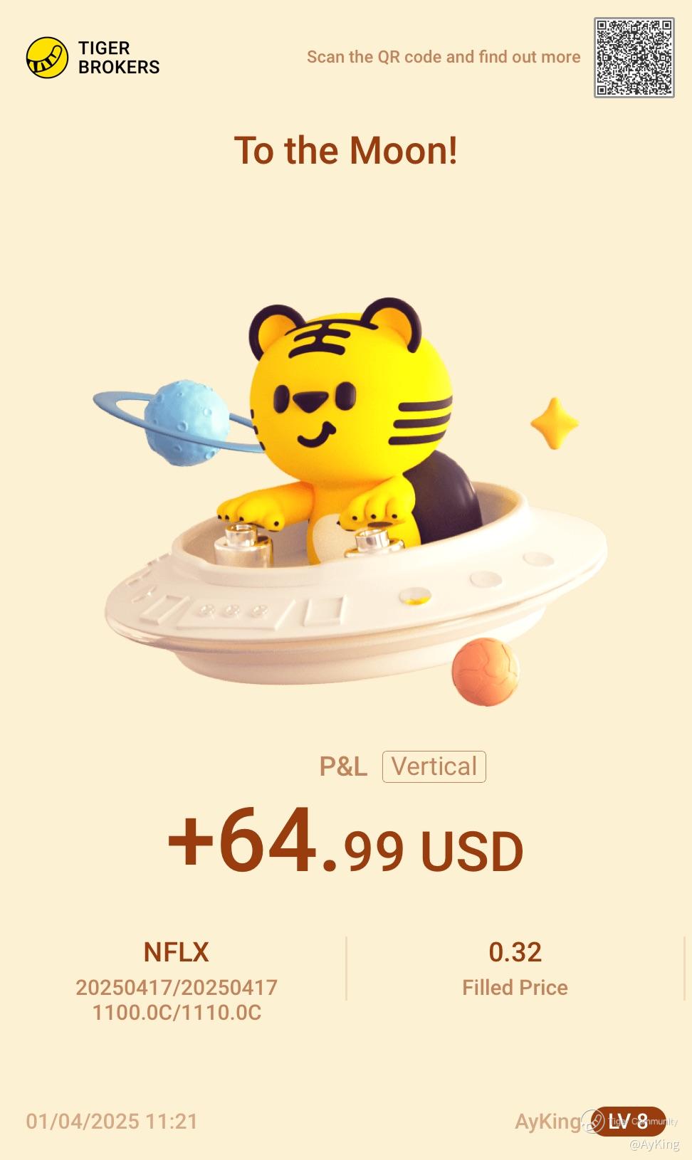 NFLX price was down, making this bear call spread profitable. Hence, I have decided to close it for some profits.$NFLX VERTICAL 250417 CALL 1100.0/CALL 1110.0$